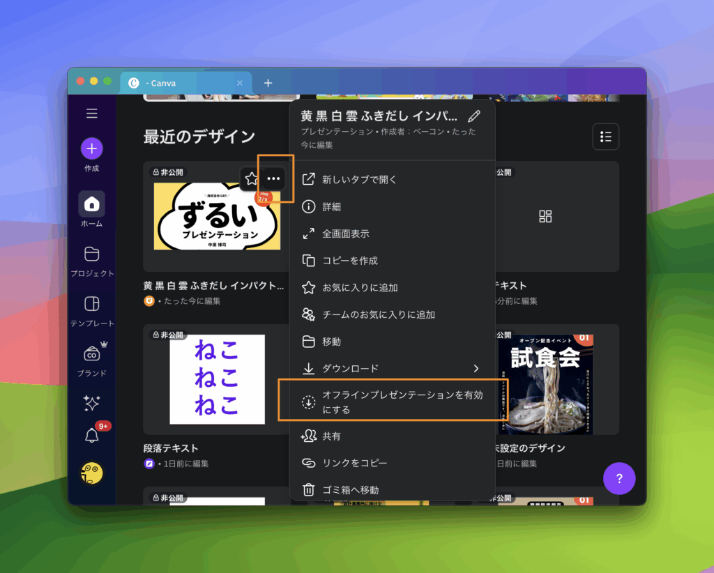 - 「⋯」メニューから 「オフラインプレゼンテーションを有効にする」 を選ぶ