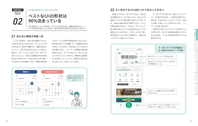 本書はアプリやWebのUIデザインに関して、基礎知識から実践で役立つヒントやノウハウを体系的にまとめた一冊です。考え方から改善に役立つ知識、実践ノウハウまで、良いUIのためにやるべきことを全部集めています。デザインをブラッシュアップしたいとき、アイデアが欲しいときにパラパラとめくりながらヒントや気づきが得られる構成になっており、初心者から経験者まで幅広く活用できます。UIデザインの考え方・グランドデザイン・ビジュアル改善・レイアウト・UIパーツの改善など、全83のノウハウを網羅しています。