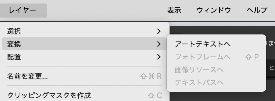「アーティスティックテキスト」→「フレームテキスト」の変換の場合はなぜか右クリックメニューからも実行できます。