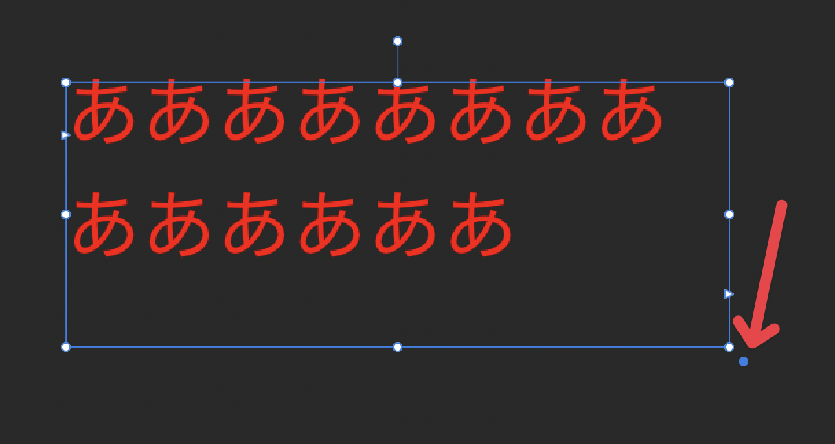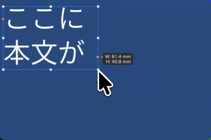 フレームテキストでは、文字サイズとフレームが連動していません。フォントサイズの数値は固定されたまま。そのため、角をドラッグしても変わるのはフレームの大きさだけで、文字は拡大されません。
