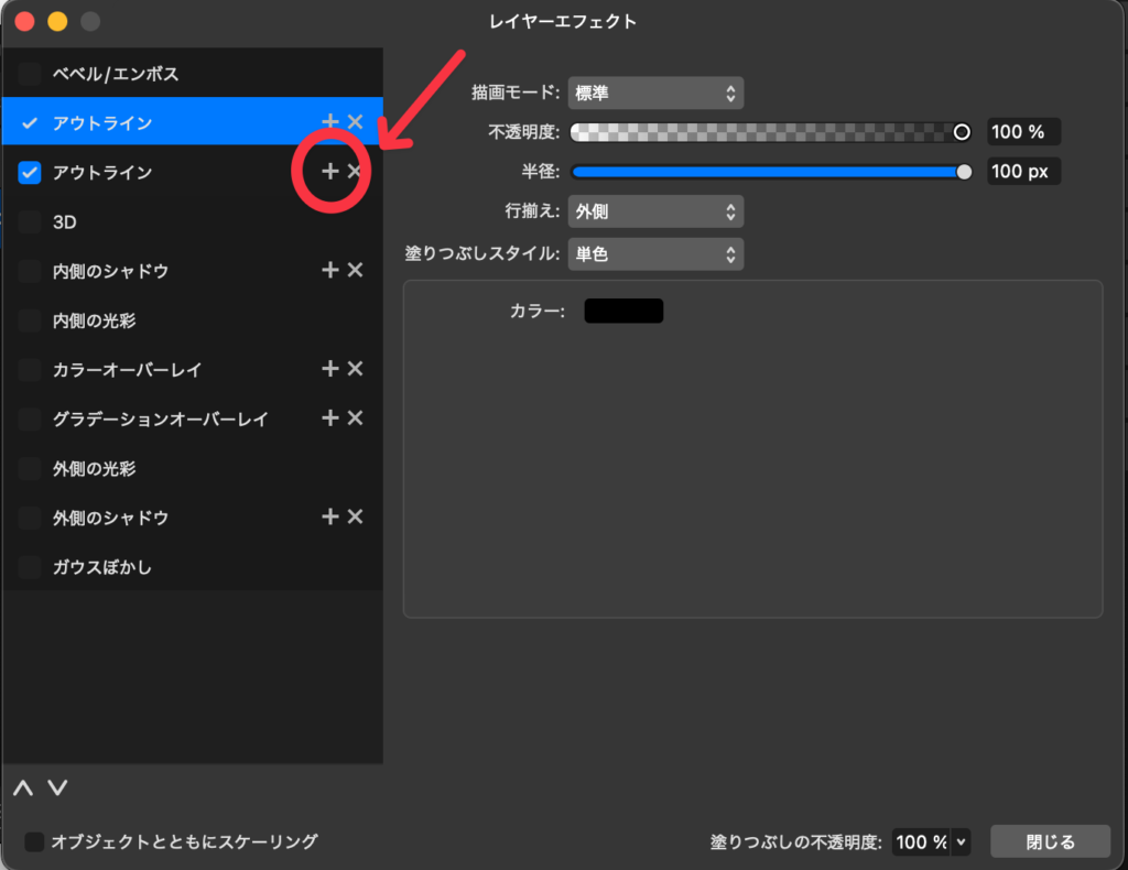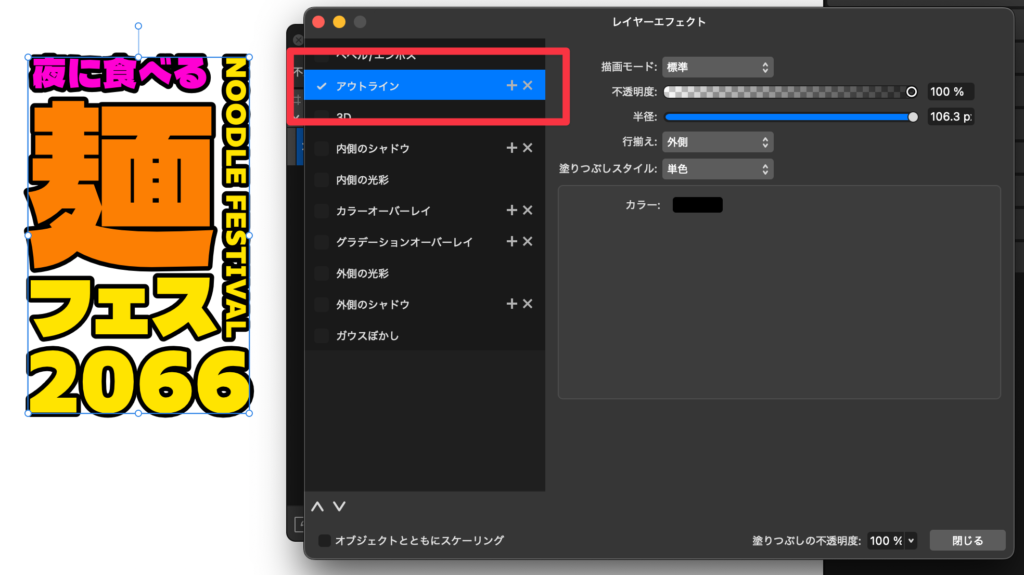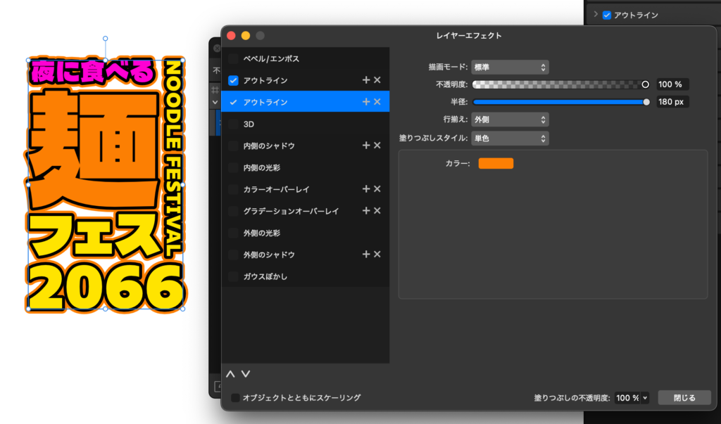 Affinityでアウトラインを2つ以上つけるときは、下の行(外側のフチ)ほど数値を大きくするのがルールです。