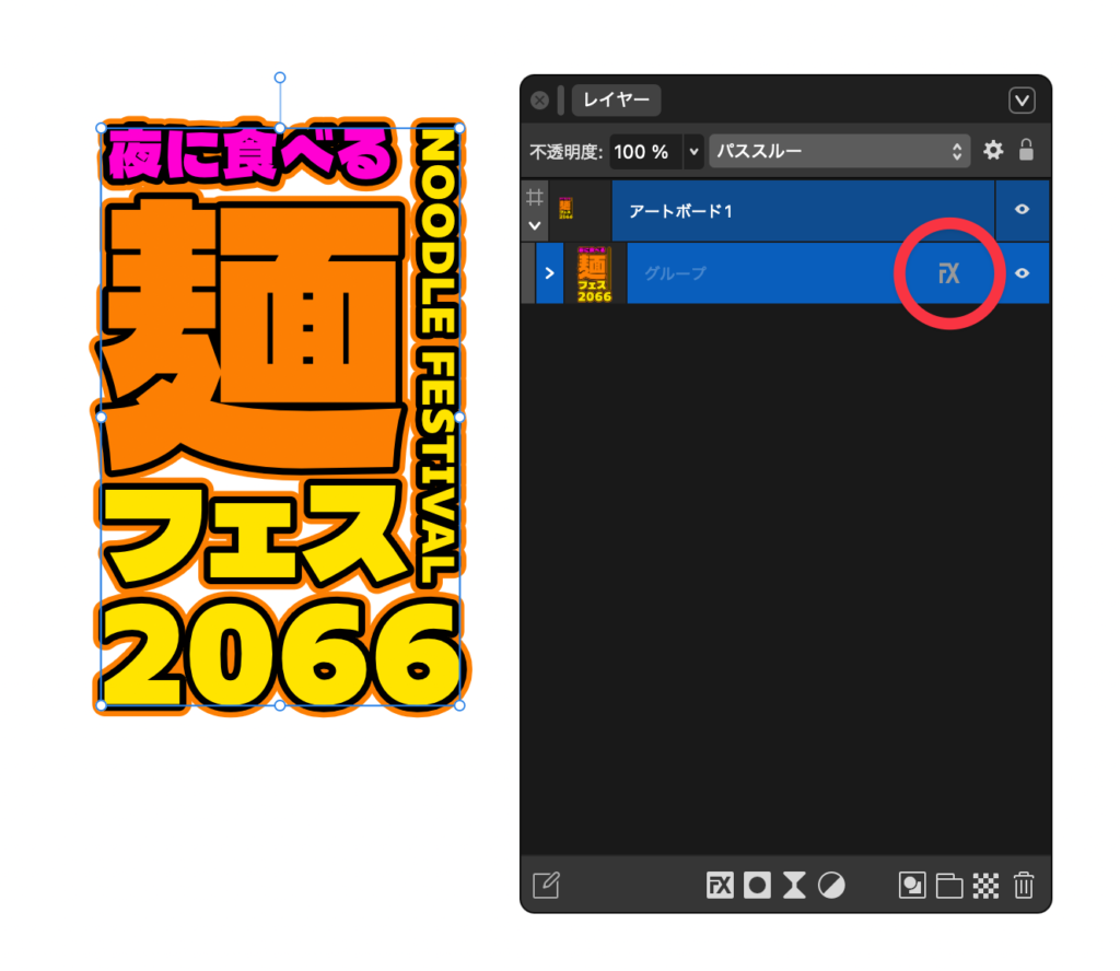 Affinityでは「レイヤー」のFXからフチ付き文字を作成します。